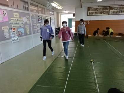 算数では、自分の歩幅について平均の考え方を使って求めました。求めた自分の歩幅を使い、いろいろな場所の長さを測りました。