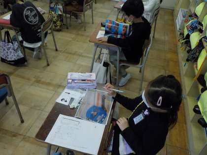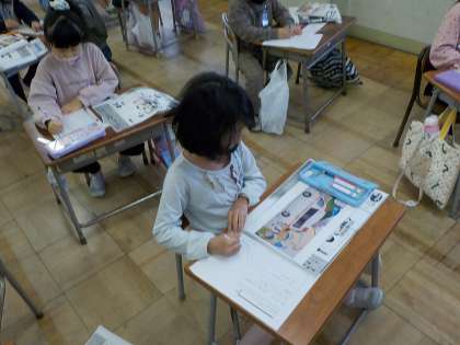 国語科「じどう車くらべ」の学習では、自分が選んだ好きな自動車について本や資料で調べて、自分だけの自動車図鑑を作っています。パトカーや救急車、クレーン車など、いろいろな自動車の「しごと」と「つくり」をワークシートに書いたり、色や特徴をとらえて詳しく絵に描いたりすることができました。完成した図鑑をみんなで見るのが楽しみです。