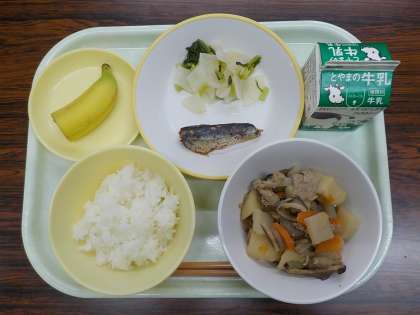 今日の献立は、ごはん、牛乳、豚肉の南蛮煮、いわしの梅煮、ゆずあえ、バナナでした。