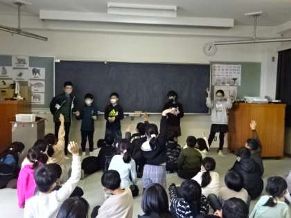 赤団・白団は、ジェスチャーゲームを行いました。進行役、ジェスチャーをする人、お題を書く人、2年生の横で一緒に活動する人など、事前に役割分担をして行いました。子供たちは、安全に、楽しくできたことに大満足の様子でした。しかし、実際にやってみると、予定になかった役割が必要になったり、思っていたより時間がかかったりしたようです。5年生は、準備の大切さや臨機応変に動く必要があることを学ぶことができました。