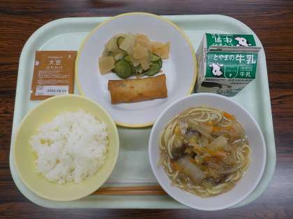 今日の献立は、ごはん、牛乳、とんこつラーメン、春巻き、華風和え、大豆ふりかけでした。