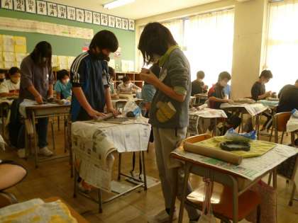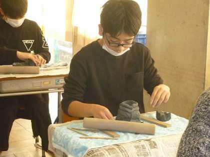 図画工作の時間に、粘土とガラスを材料に使った作品を作りました。焼くとガラスが溶けて水の流れのように見える粘土作品です。ガラスの溶け具合を想像しながら作りました。