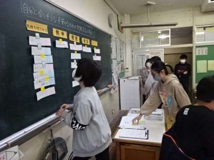 今日は、悩みや不安を抱えたときの対処法について、1週間の実践の結果をもとに話し合いました。様々な対処法があることを知り、自分に合いそうな対処法は何だろうと考える子供たちの姿がありました。養護教諭からは、だれかに話したり、その不安に立ち向かって解消したりする方法があることを教えてもらい、納得している様子でした。これからの生活にぜひ活かしてほしいと思います。