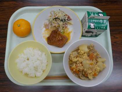 今日の献立は、ごはん、牛乳、卵とじ、照焼きチキン、チンゲンサイソテー、みかんでした。