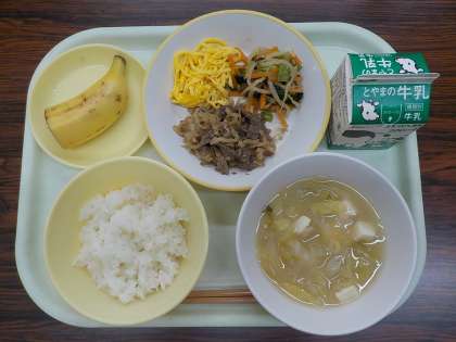 今日の献立は、ごはん、牛乳、ビビンバ(焼肉、ナムル、錦糸卵)、みそ汁、バナナでした。