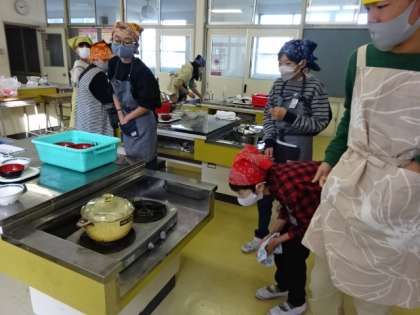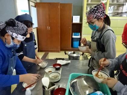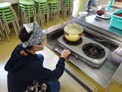 1組に引き続き、2組でも調理実習を行い、班ごとにお米を炊きました。お米や水の計量→吸水→炊く→蒸らすのすべての工程を体験し、おいしくいただきました。