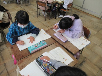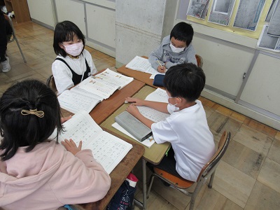 国語科では、身近なことで困っていることやみんなに相談して考えを聞いてみたい話題をもとに、グループで話し合っています。子供たちから出た話題は、「苦手な食べ物をどうやって食べるといいのかな」「天気の悪い日にどうやって遊んだらいいのかな」などです。友達の話に耳を傾け、「私と同じ意見だね」「どうしたらいいのだろう」など、活発に意見を出し合い、考えを深め合っています。
