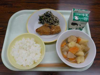 今日の献立は、ごはん、牛乳、魚の利久揚げ、磯和え、関東煮です。