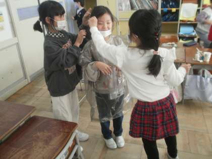 作ったおもちゃを紹介し合い、交換して遊びました。自分のグループでおもちゃの遊び方を説明しながら遊ぶ子や、どんどん他のグループのおもちゃを見に行って遊ぶ子、作った服を友達に着てもらう子など、どの子もとても嬉しそうに活動していました。