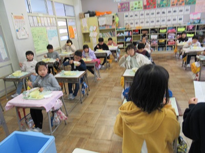 明日、2組が1組のみなさんをわくわくおもちゃランドに招待するために、給食の時間にお知らせに行きました。みんな真剣にお知らせを聞いています。「楽しんでもらえるといいな」という気持ちを高めています。
