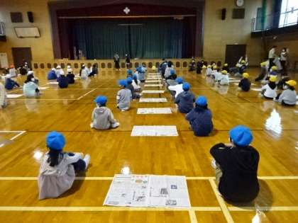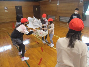 5年生と2年生のペア学年で、「そよかぜ集会」を行いました。新聞に乗せたボールを落とさないように渡し、ゴールするまでの速さを競うゲームをしました。そよかぜ委員は、司会をしたり、担当の団に声をかけたりしました。5年生は、ペアになった2年生と新聞紙を持つ高さを合わせたり、「前に立っている人が話しているからしっかり聞こうね」と声をかけたり、上級生としての自覚をもって参加しました。5年生のすてきなところを、たくさん見ることができるひとときでした。