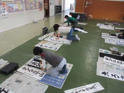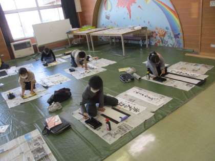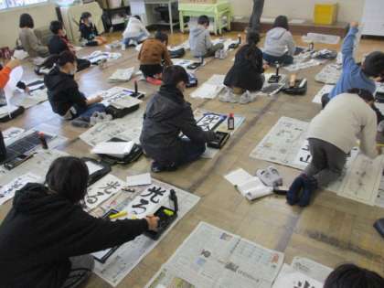 書初め大会に向けて、教室や多目的ルームで「光る立山」の練習をしています。字のバランスを意識し、丁寧に書こうと、集中して取り組んでいます。
