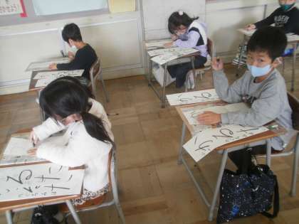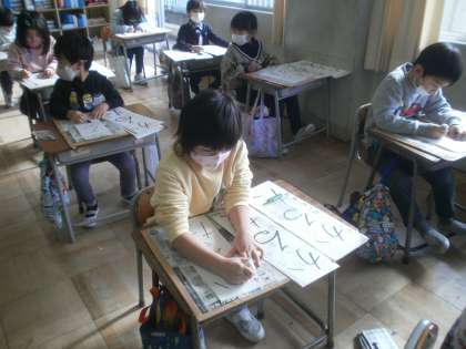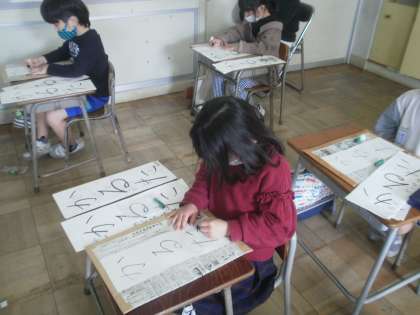 初めて持つ硬筆墨で、書初め「かるた」に挑戦しています。正しい姿勢で書くことやお手本を見て大きく丁寧に書くことを意識しています。
