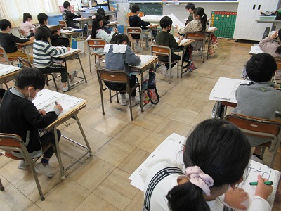 書初めの練習が始まりました。今年は「竹うま」という字を書きます。文字の大きさやはらい方に気を付けながら、真剣に書いています。作品は教室前廊下に掲示してありますので、明日から始まる個別懇談会の際に、どうぞご覧ください。