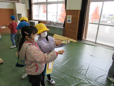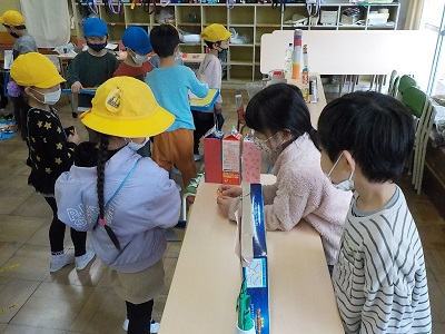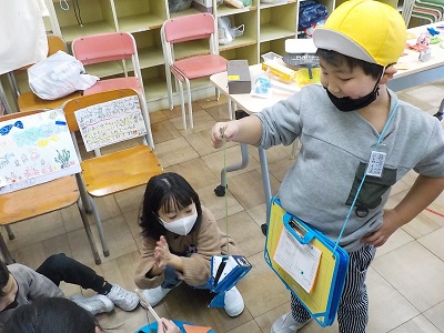 1年生さんにおもちゃを上手に飛ばす方法を教えてあげたり、遊び方を紙に書いた物を見せながら伝えたりしました。