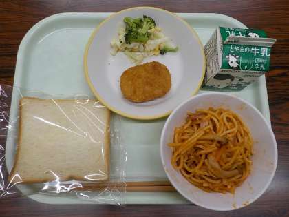 今日の献立は、食パン(減)、牛乳、スパゲッティナポリタン、コロッケ、カラフルサラダでした。