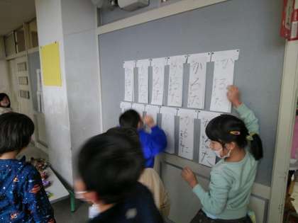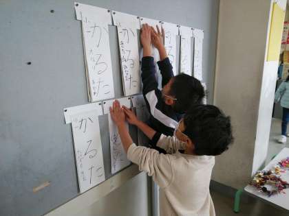 課題である「かるた」の練習を重ね、少しずつ大きく丁寧に書けるようになってきました。「○○さんの【る】が上手だね」「名前が苦手だけど、がんばろう」と、自分の書いた字を振り返りながら、上達するように練習しています。