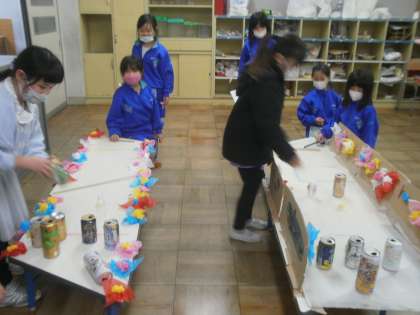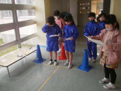 2年生さんから招待状をもらい、「にこにこおもちゃランド」に遊びに行きました。遊んだら押してもらえるスタンプカードや、折り紙で作った景品等、うれしい工夫がいっぱいでした。2年生さんから遊び方を教わったり、「すごい、やったね」と声をかけてもらったりしながら、1年生は大喜びで遊び、たくさんの景品をもらうことができてうれしそうでした。
