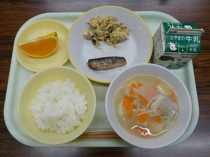 今日の献立は、ごはん、牛乳、いわしの梅煮、卵とチンゲンサイの炒め物、いものこ汁、あいかでした。