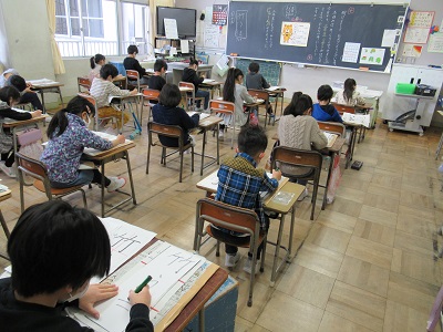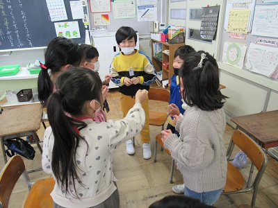 書初め大会では、教室がしーんと静まりかえり、一文字ずつ丁寧に書きました。その後の学級活動では、ミニゲームをしました。失敗した友達がいると「ドンマイ」と声をかけたり、ゲームを終えたら、「いえーい」と言って肘タッチをしたり、久しぶりに会う友達と中を深める子供たちでした。