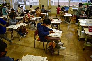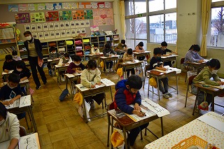書初めに取り組む様子です。 1、2年生は硬筆墨を使った書初めです。