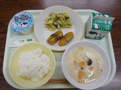 今日の献立は、ごはん、牛乳、ちくわのカレー揚げ、しょうがひたし、豆乳汁、ヨーグルトでした。