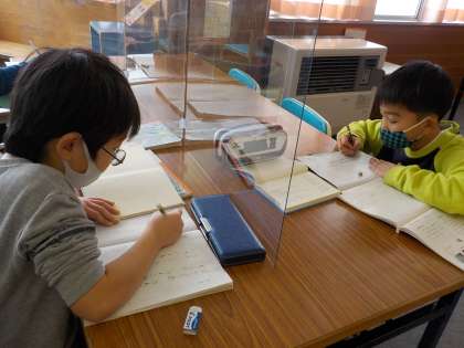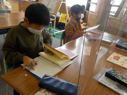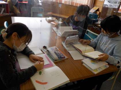図書室で詩が書いてある本を読みました。お気に入りの詩を見付けて、ノートに視写しています。