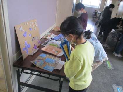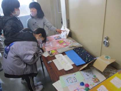 図画工作科では、「これでえがくと」の鑑賞をしました。友達の作品を見て、材料の使い方について質問したり、たくさんの鑑賞カードを書いたりしていました。