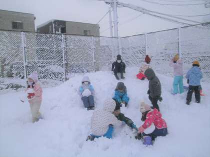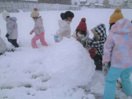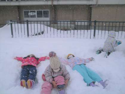 フワフワの雪がたくさん積もった校庭で、雪遊びを楽しみました。雪の上に寝転がったり、大きな雪だるまを作ったりして、思い思いに楽しみました。