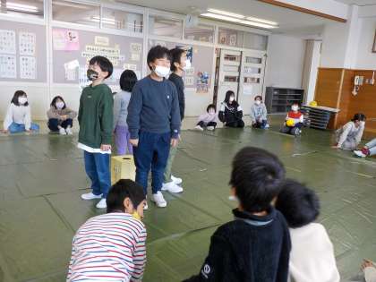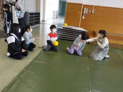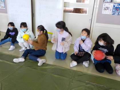 学年で「爆弾ゲーム」をして遊びました。自分のところでボールが止まったら、「?ボックス」のお題に答えることになります。子供たちは、ドキドキしながらボールを友達に渡していました。