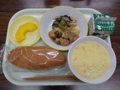 今日の献立は、コッペパン、牛乳、あっさりチキン、海藻サラダ、野菜ポタージュ、カットパインでした。
