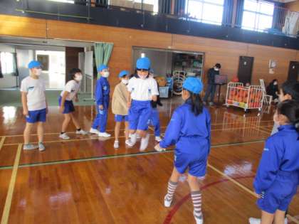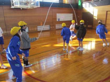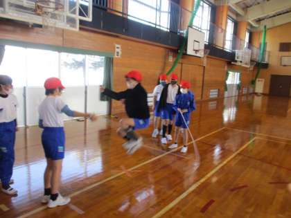 体育科の授業で長縄跳びをしました。時間以内に多く跳ぶために、並び方を話し合ったり、跳ぶタイミングで声をかけ合ったりしました。その結果、ほとんどの団が最初より多く跳べたので、子供たちは大満足でした。