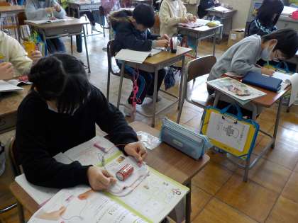 豆電球と乾電池をどのようにつなぐと明かりがつくか調べました。子供たちは様々なつなぎ方を考え、試していました。