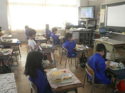 子供たちは「のらねこスープって、何が入っているのかな」など、献立を見ながら給食の時間を楽しみにしていました。給食中は、今日のメニューの「ちいさなおばけシリーズ」の献立紹介や栄養士さんの仕事内容の放送を見ながら、うれしそうに食べていました。