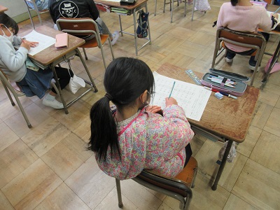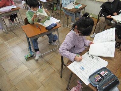 似た意味、反対の意味の言葉の学習のまとめをしました。白の反対は黒、天の反対は地など、ぱっと思い浮かばない意味を考えたり、分からない漢字を調べたりしました。