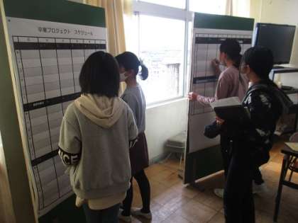 卒業を祝う週間に向けて、グループごとにプロジェクトを進めています。プロジェクトリーダーと各グループ長が「いつまでに何をするのか」「他のグループの進み具合はどんな様子か」など、スケジュールを確認し合っています。祝う週間で大切にしたい思い「笑顔 Smile」「元気 Power」「ありがとう Thanks」を合い言葉に、今後も学習を進めていきます。