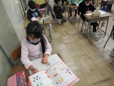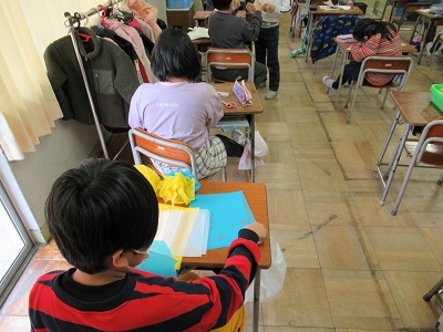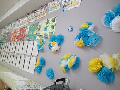 飾り係は、お花紙を使って教室の壁に飾るお花を作っています。教室の背面の壁が、お花で明るくなってきました。また、クイズ係は、みんなが楽しめるクイズを考えています。問題の横にイラストを書き、見る人に伝わりやすいように工夫しています。