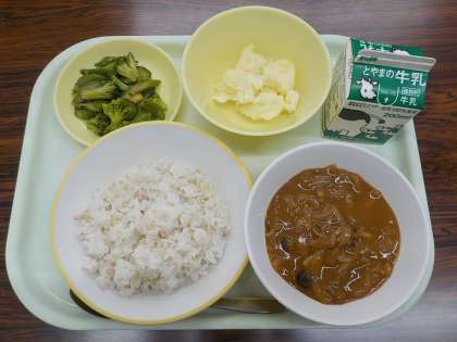今日の献立は、麦ごはん、牛乳、ビーフストロガノフ、チーズポテト、グリーンサラダでした。