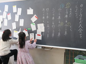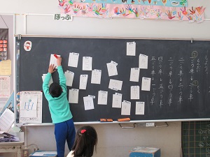 2つの漢字を合体させて1つの漢字にするという問題を作りました。今日は作った問題を友達に出し合うゲームをしました。習った漢字を復習したり、読み方を確認したりして、楽しみながら学習しました。