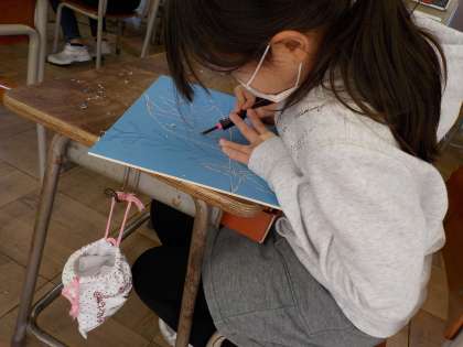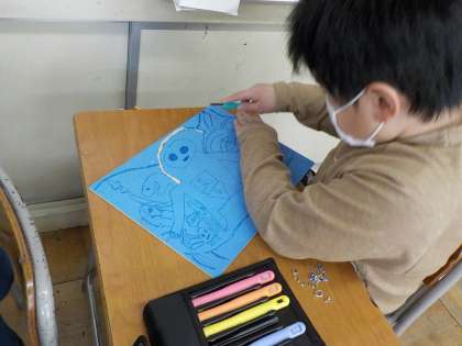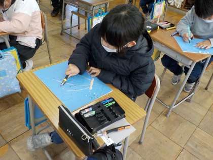 初めての木版画では、彫刻刀を使って線彫りに挑戦しています。子供たちは、彫刻刀の進行方向と手の置き方に気を付けて、慎重に彫っていました。