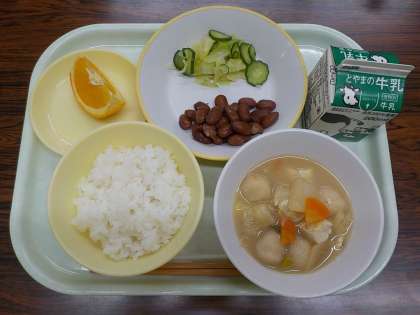今日の献立は、ごはん、牛乳、ちゃんこ鍋、煮豆、きざみ和え、いよかんです。