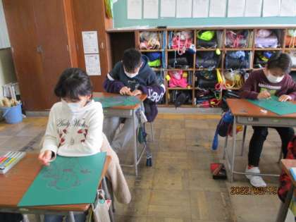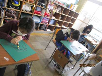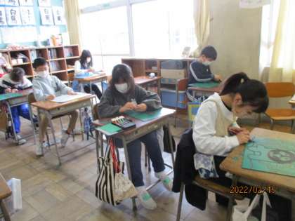 板の両面を使って版画をします。表面の周りは面彫りをします。たくさん彫る部分がありますが、落ち着いて自分のイメージに合った作品を彫り進めています。