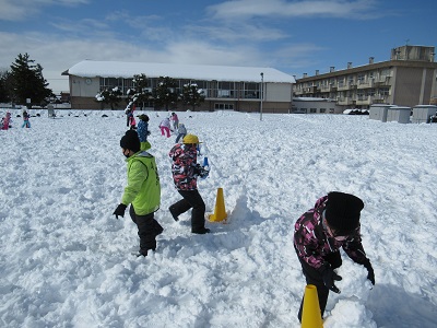 今シーズン3回目の雪遊びをしました。今日の雪は、ふかふかで、踏み心地が気持ちよく、子供たちは一目散にグランドへ走って行きました。