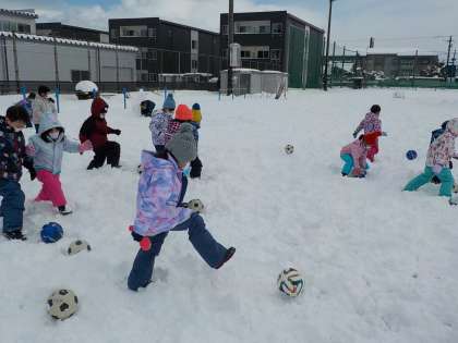 前半は雪の上でサッカーボールを使い、ゴールの雪山に向かってドリブルをしたり、キックをしたりして楽しみました。子供たちは、「動きづらくて蹴りにくいな」「雪がボールについて重くなるよ」「雪の上で蹴るのも楽しいね」と四苦八苦しながら一生懸命ゴールに向かっていました。