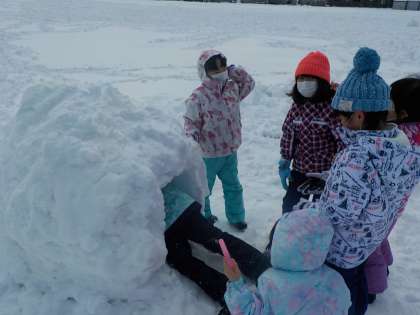 後半は、たくさんの雪を使って遊んだり、かまくらを作ったりしました。あるグループでは、一人分のかまくらに、みんなで交代しながら入っていました。