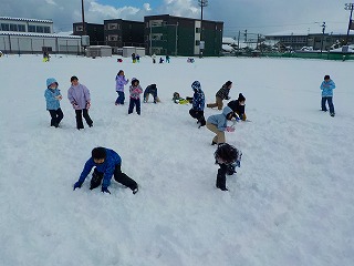 今日の雪遊びは、木曜日の学び合いタイムで決めた雪合戦をしました。雪合戦が終わった後に、当てた人に「大丈夫?」「ごめんね」と声をかけるというきまりをつくって臨みました。子供たちのスポーツマンシップが垣間見えました。