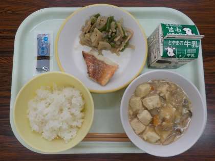 今日の献立は、ごはん、牛乳、赤魚の塩焼き、れんこんのきんぴら、豆腐と野菜のうま煮、のり佃煮でした。