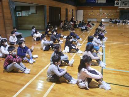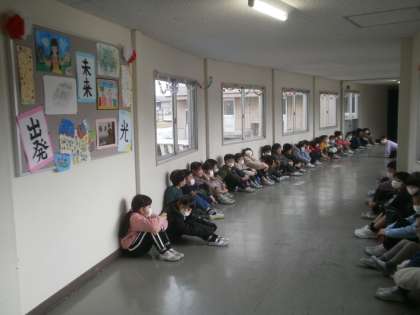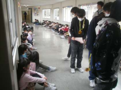 いよいよ、6年生に「ありがとうマーチ」で感謝の気持ちを伝えます。写真は、本番前の緊張した子供たちの様子です。6年生の入場を、拍手で迎えました。