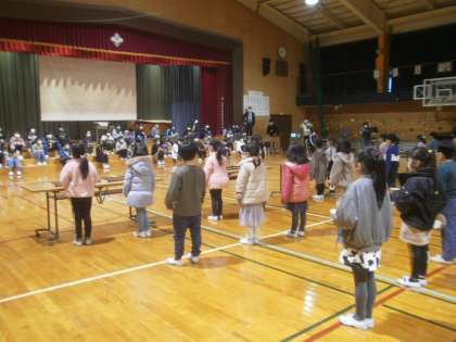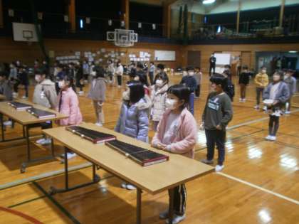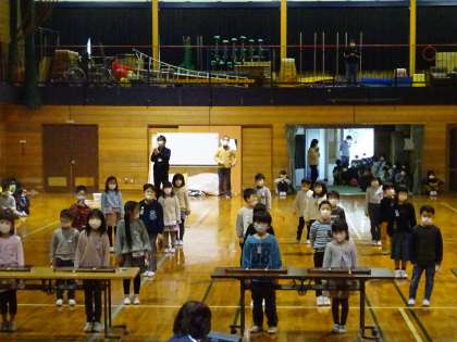 体育館の両サイドから5年生や先生方に見守られ、ステージのひな壇に座る6年生に歌と合奏を発表しました。緊張した表情の子供たちでしたが、呼びかけでしっかり感謝の気持ちを伝え、歌と合奏で「ありがとう」の気持ちを表現しました。
