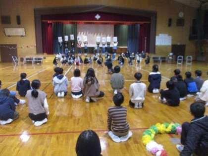 にっこりアートを作成している各学年の様子をまとめたスライドも作成し、6年生に見てもらいました。「笑顔・元気・ありがとうの気持ちを6年生に届けよう」という祝う会の目当てを、在校生みんなで届けらた瞬間でした。